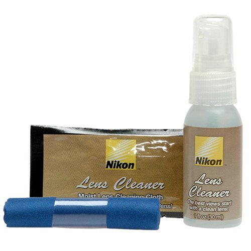 The Nikon Lens Cleaning Kit contains everything you need to keep your lenses optical equipment and other gear fresh and clean. Includes 1 fl. oz. Spray Bottle of Liquid Lens Cleaner Pack of 3 Moist Lens Cleaning Cloths and a Microfiber Cleaning Cloth. Cleaning solution removes dust dirt and oily fingerprints Cleans without dripping streaking or staining Microfiber cloth cleans screens and glass without scratching Works on any type of lens or glass Will not scratch or damage lenses